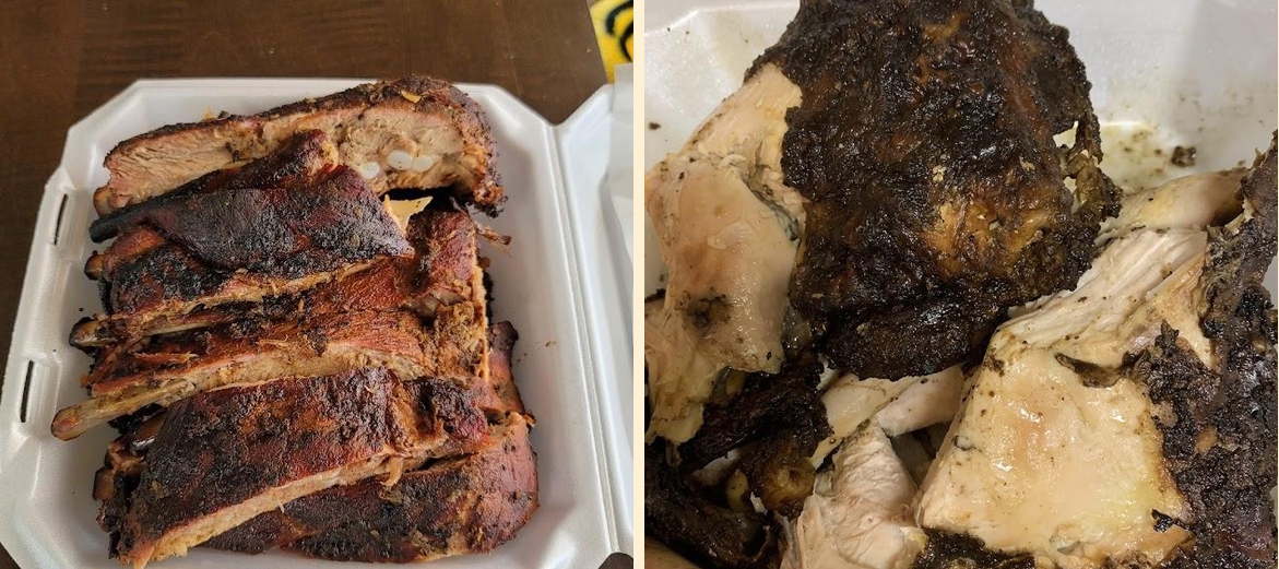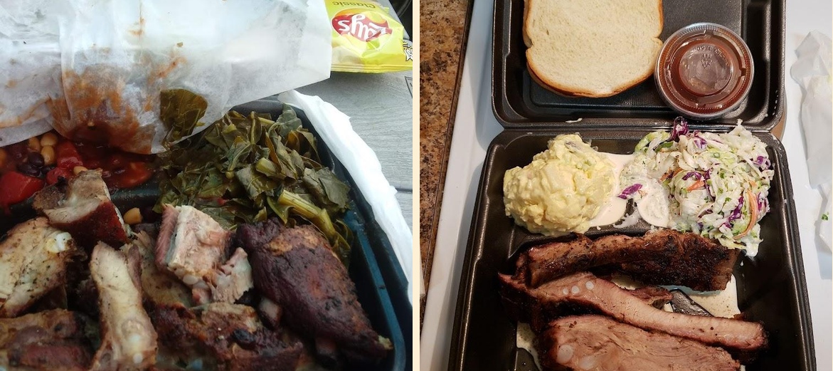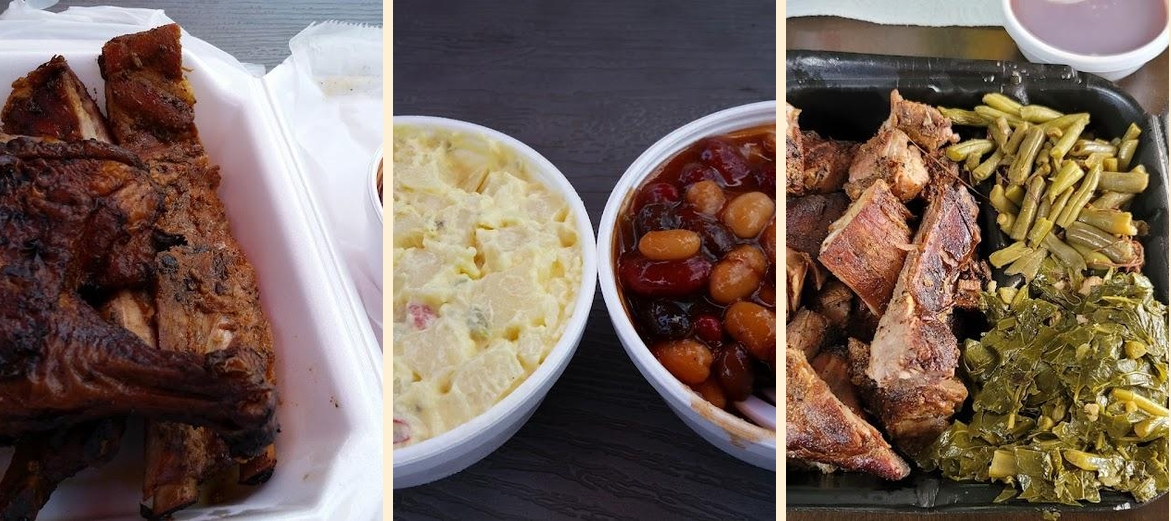 Juicy Ribs specializes in traditional barbecue dishes. Their menu features juicy ribs, chicken, and hearty sides like potato salad and Brunswick stew.