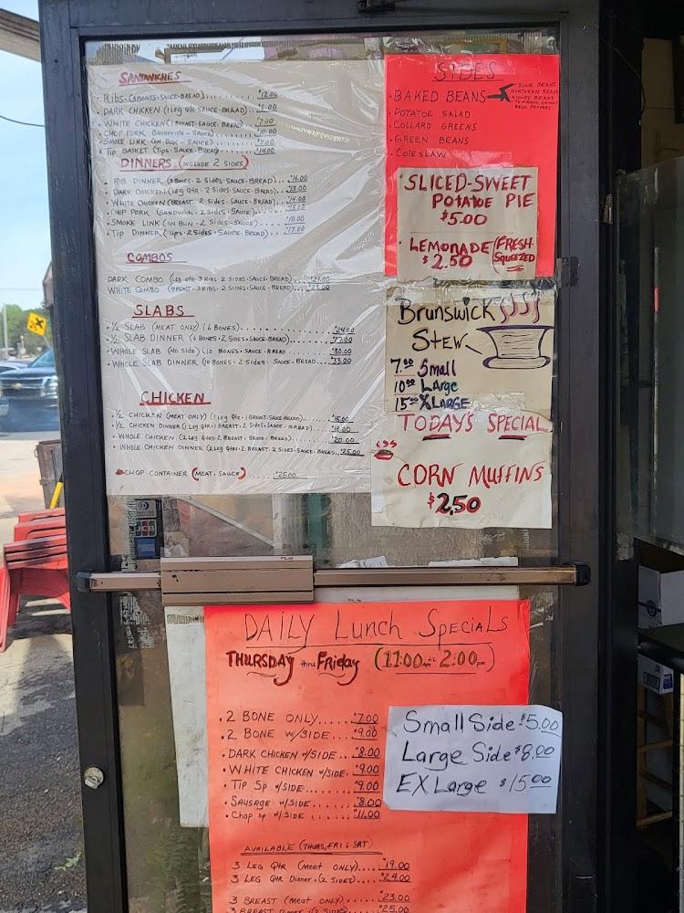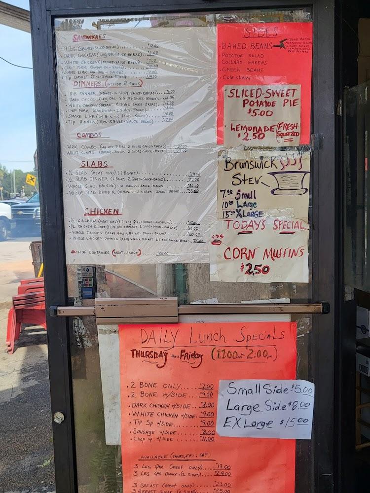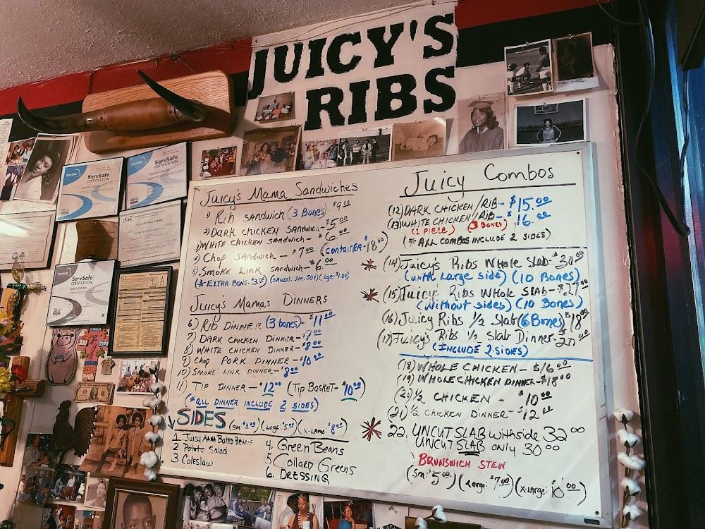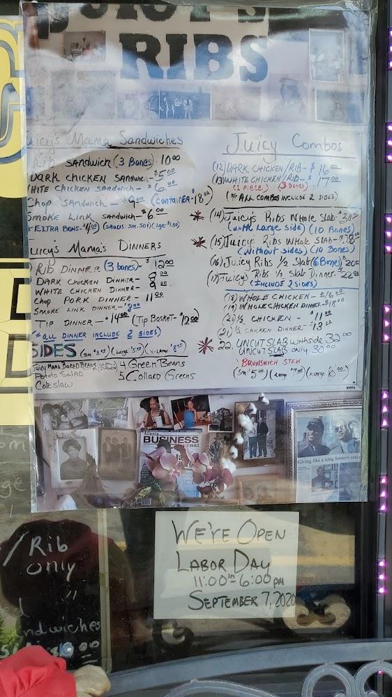 Juicy Ribs features a variety of BBQ delights. Their menu includes juicy ribs, dark and white chicken, and flavorful pork dishes. Enjoy classic sides like collard greens and potato salad. They also offer a delicious Brunswick stew for a hearty option. Prices are budget-friendly, averaging around $11.50. Beverages like can sodas and bottled water are also available. This spot emphasizes traditional Southern comfort food, ensuring satisfaction with every bite.